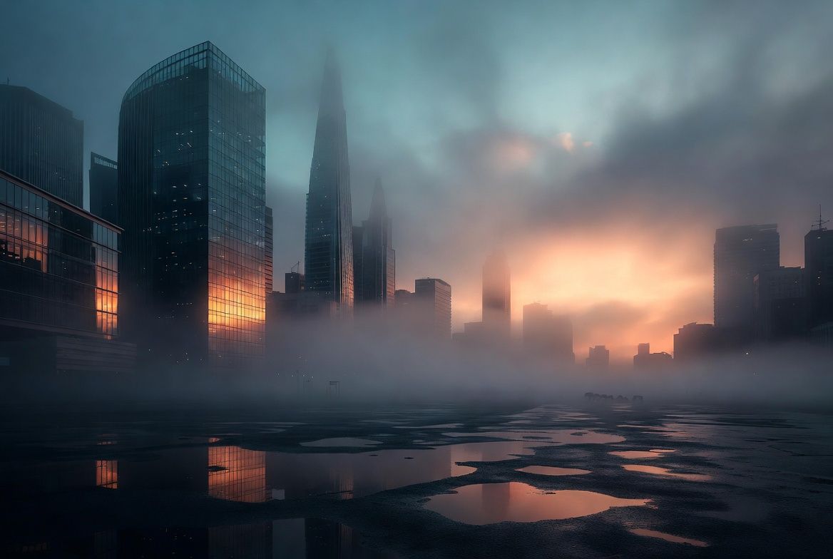 Wide establishing shot of a near-future city at dawn, soft mist between glass towers, glowing amber reflections on wet pavement, calm mood, slow-pan feel implied, 16:9.