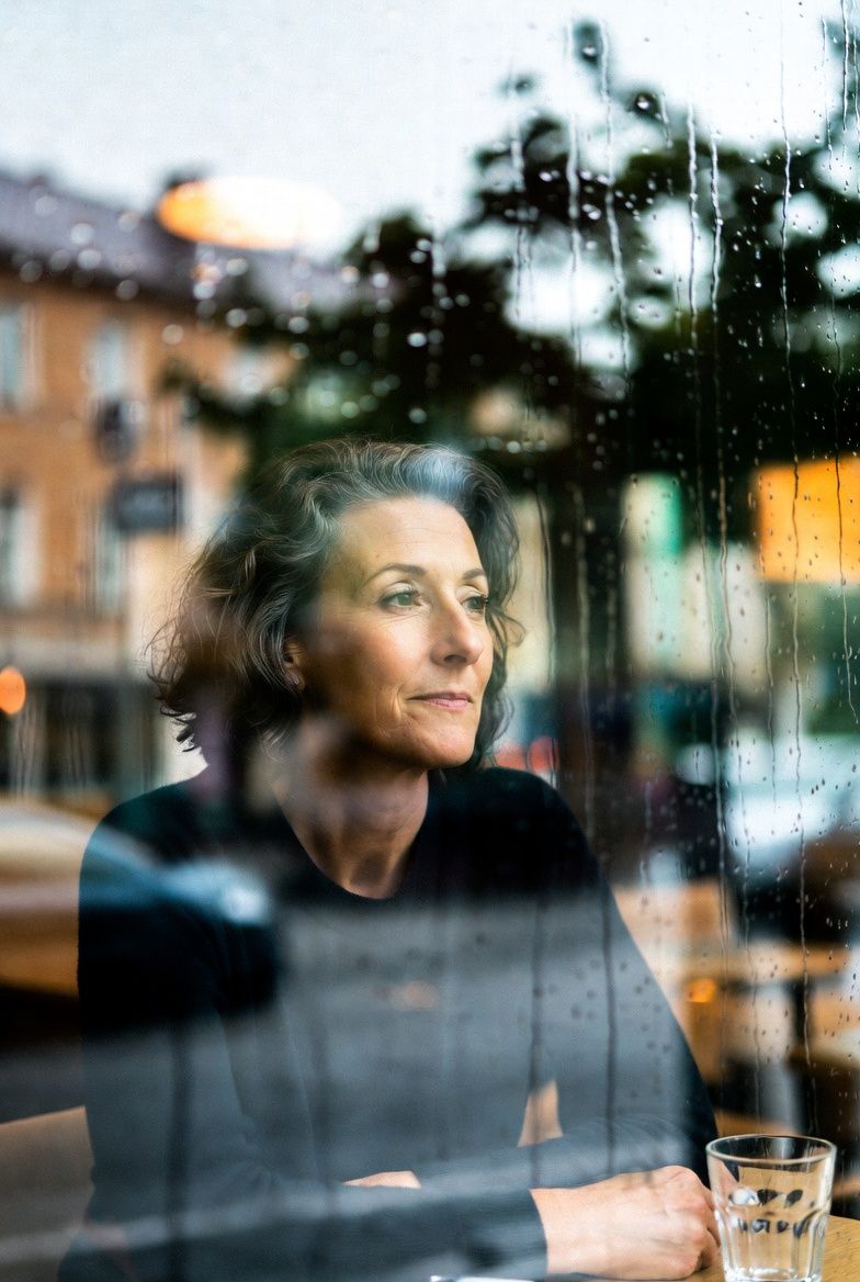 Close-up of a woman in her 50s sitting at a rain-streaked café window, November afternoon light, soft bokeh background, contemplative mood, 85mm lens, film grain, editorial photography.